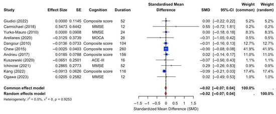A random-effects meta-analysis was conducted to assess the effect of n-3 FA supplementation on global cognition. The analysis included 11 RCTs that specifically compared n-3 FA supplementation against placebo controls. Cognitive outcomes varied across studies and included measures such as the MMSE, composite scores, MoCA, ACE-III, and 3MS, with intervention durations ranging from 12 to 260 weeks. The pooled SMD was −0.02 with a 95% CI of [−0.07, 0.04], indicating no statistically significant effect of n-3 FA supplementation on global cognition compared to placebo (Figure 2). There was no evidence of heterogeneity across studies (I2 = 0.0%, τ2 = 0, p = 0.9253).