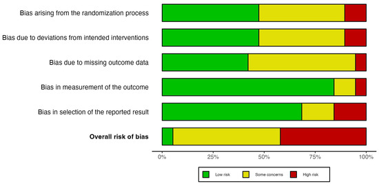 The risk of bias was assessed using the Cochrane Risk of Bias Tool version 2, which evaluated bias in five domains: (1) bias arising from the randomization process, (2) bias due to deviations from intended interventions, (3) bias due to missing outcome data, (4) bias in measurement of the outcome, and (5) bias in selection of the reported result [11]. Each domain was classified as “High risk”, “Some concerns”, or “Low risk” by two independent raters. A third researcher resolved the conflict in case of any mismatch between raters. The traffic light and summary plots were produced with the robvis package in R (Version 0.3.0, released on 22 November 2019) [12].