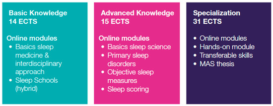 The MAS in Sleep Medicine encompasses three pillars. Online modules and schools (which can be attended in person or virtually) offer all participants the same information during the 1st pillar (basic knowledge), a subsequent progressive specialization in pillars 2 and 3, and a thesis at the end of the MAS (https://www.asc.unibe.ch, accessed on 1 March 2024).