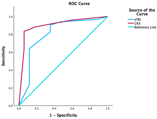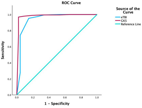 For the GCS score, the cut-off point was 8.5, with a sensitivity of 97.9%, specificity of 92%, positive predictive value of 91.5%, and negative predictive value of 78.4%. For the eTBI score, the cut-off point was 3.5, with a sensitivity of 95.2%, specificity of 85.2%, positive predictive value of 81.6%, and negative predictive value of 76.3% (Table 3 and Table 4).
