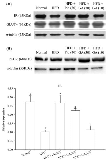 Figure 2 shows that HFD significantly decreased the expression of IR by 67.1% in normal rats. Administration of 10 or 30 mg/kg body weight GA increased IR expression by 18.9% and 51.5% in HFD rats, respectively (p < 0.05) (Figure 2A). HFD also led to a 34.5% decrease in GLUT4 expression in the normal rats (p < 0.05) (Figure 2A). Administration of 10 or 30 mg/kg body weight GA remarkably restored the expression of GLUT4 by 70.5% and 22.3% when compared with the negative control group (p < 0.05) (Figure 2A). The expression of PKC-ζ declined by 29.3% in HFD rats compared with the normal group (p < 0.05) (Figure 2B). Administration of 10 or 30 mg/kg body weight GA enhanced PKC-ζ expression by 71.3% and 86.6%, respectively, in HFD rats (p < 0.05) (Figure 2B).