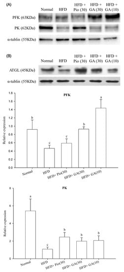 Effect of GA on the expression of carbohydrate (A) and lipid (B) metabolism-related proteins in adipose tissue of HFD rats. GA: gallic acid; PFK: phosphofructokinase; PK: pyruvate kinase; ATGL: adipose triglyceride lipase; Normal: rats fed a normal diet; HFD: rats fed a 66% fructose diet; HFD + Pio (30): rats fed a 66% fructose diet and orally administered pioglitazone (30 mg/kg body weight); HFD + GA (30): rats fed a 66% fructose diet and orally administered GA (30 mg/kg body weight); HFD + GA (10): rats fed a 66% fructose diet and orally administered GA (10 mg/kg body weight). Different letters (a–c) indicate a significant difference at p < 0.05. Values calculated as the means ± SD for six rats in each group. The relative expressions of PFK, PK, and ATGL in each treatment group were calculated using α-tublin as the standard.