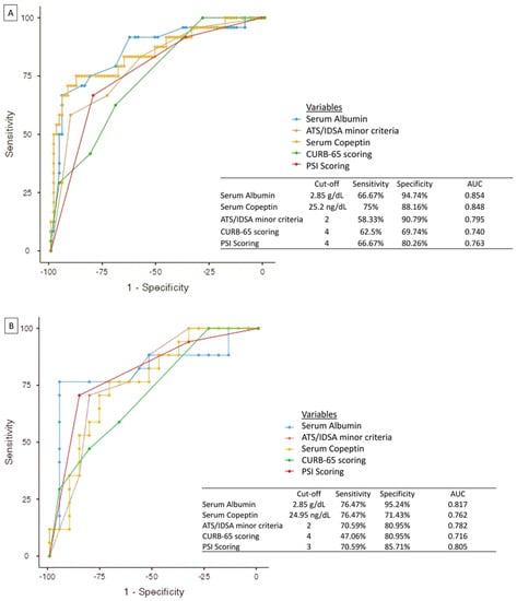 | Present study, 2021, India | 100 | Albumin, copeptin | Combined ICU admission or mortality at day 7 and clinical instability after 72 h. | Albumin was the best predictor of mortality (AUC = 0.854), followed by copeptin (AUC = 0.848). The combination of serum albumin + serum copeptin + ATS/IDSA had the highest AUC for prediction of ICU admission or death within 7 days (AUC = 0.911) and for prediction of clinical instability after 72 h of admission (AUC = 0.905). |