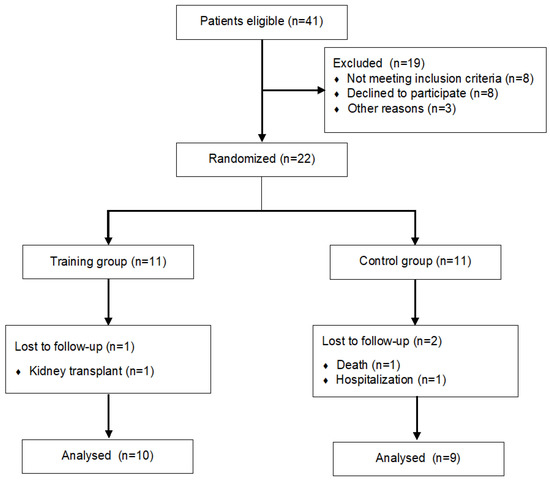 Three patients dropped out early from the trial due to death or hospitalisation or for kidney transplantation (Figure 1). The final analysis was performed on 10 patients for the RMT group and 9 for the C group. Additionally, this subsample of patients did not present any baseline difference.
