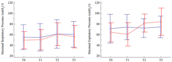 Both MIP and MEP values significantly improved in the RMT group at the end of training (T2), with MEP values that remained significantly higher than baseline at follow-up (T3). Stable values over time were observed for the CON group. A significant between-group difference in variations from baseline to the end of treatment was observed for MEP (p = 0.008), with a mean difference of 23 cmH2O (95% CI 7 to 39) in favor of the RMT group. No significant differences were noted for MIP variations (p = 0.53). The data are presented in Table 3 and Figure 2.