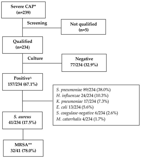 - He, H.; Wunderink, R.G. Staphylococcus aureus Pneumonia in the Community. Semin. Respir. Crit. Care Med. 2020, 41, 470–479. [Google Scholar] [CrossRef] [PubMed]