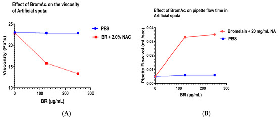(A) In artificial sputa (AS), there was a noticeable drop in viscosity after treatment with BromAc (bromelain 125 and 250 µg/mL + NAC 20 mg/mL). (B) In AS, the flow rate increased with the addition of BromAc. (C) In simulated sputa (SS,) there was a considerable drop in viscosity with the addition of 125 or 250 µg/mL bromelain + NAC 20 mg/mL. (D) In SS, there was almost a linear increase in flow rate (pipette emptying time) with the addition of increasing amounts of bromelain and 20 mg/mL NAC.