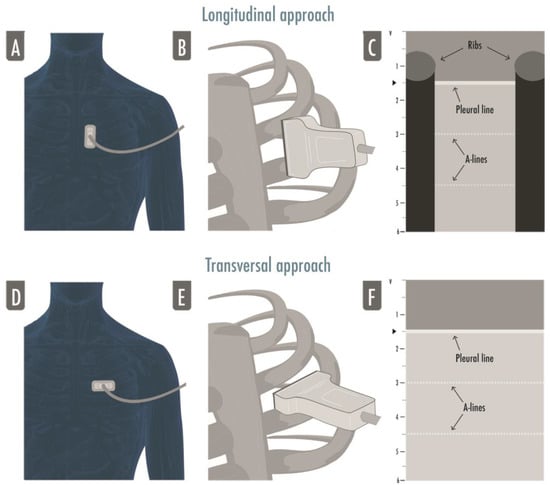 The figure illustrates both approaches to lung ultrasound: the longitudinal approach (A–C) and the transversal approach (D–F). In the longitudinal approach, the probe is aligned to the craniocaudal axis of the patient and perpendicular to the ribs’ axis (A,B), giving the characteristic ultrasonographic image of the two ribs and their shadows defining the pleural line in the middle, the so-called bat sign (C); in the transversal approach the probe is placed in the intercostal spaces, parallel to the ribs’ axis (D,F), so that a larger pleural section can be displayed without any rib’s shadows visualized (F).