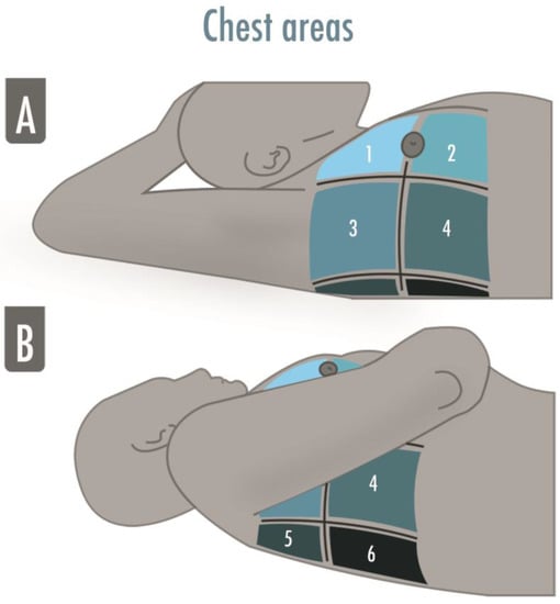 The illustration shows the six-areas division of a hemithorax in a supine patient for a comprehensive lung ultrasound examination. The anterior and the posterior axillary lines divide the hemithorax into three parts, which are finally divided into superior and inferior. The areas may be numbered from “1” to “6”, corresponding, respectively, to the anterior–superior and the inferior–posterior areas. (A) Zone 1 and 2 are superior and inferior anterior scans, zone 3 and 4 are superior and inferior lateral scans; (B) Zone 5 and 6 are superior and inferior posterior scans.