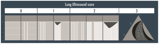 The lung ultrasound score is represented in the illustration above. Score 0 corresponds to the visualization of the A-lines only or with less than three B-lines per scan; score 1 is given if three or more well defined B-lines or coalescent B-lines/sub-pleural consolidations are visualized but they cover < 50% of the inspected zone; score 2 corresponds to the presence of multiple B-lines (coalescent or not) or sub-pleural consolidations occupying > 50% of the visualized pleura; score 3 is finally assigned when a clear tissue-like pattern is observed.