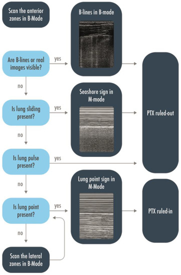 LUS may be used either in the ED or in the ICU to rule in or rule out a pneumothorax, to give the indication for a drainage and localize the site of insertion of the tube, and to semi-quantify the extension of the pneumothorax and monitor the residual presence of air after the drainage [17,18]. Misdiagnoses are frequent with anteroposterior chest X-ray (CXR), especially for an anterior pneumothorax, which cannot be easily visualized in supine patients. Computed tomography (CT) is the gold standard technique to confirm the diagnosis, but the patient must be transferred to the radiology service to get the exam, and it may take too long, in particular in unstable patients or hypertensive pneumothoraxes. LUS was proposed many years ago as a technique to rule out a pneumothorax in intubated patients [19], and its usefulness has been confirmed by further studies [11,19]. Either in a trauma patient or in a critically ill, mechanically ventilated patient, when a pneumothorax is suspected, the anterior areas of the thorax have to be evaluated first. Visualization of real images (consolidations/effusions) or B-lines, each representing a safe demonstration of the pleurae adhesion, permits us to rule out a pneumothorax with a negative predictive value of 100% [20,21]. After having correctly identified the pleural line, the lung sliding has to be looked for: lung sliding rules out a pneumothorax with a 100% negative predictive value. An M-mode could be used to help in its identification, when doubtful, thanks to its higher frame rate, and to objectify the motion of the pleura in a printable image. The seashore sign should be then visualized [13]. If the lung sliding is absent but the lung pulse is visualized, a pneumothorax is again ruled out with a 100% negative predictive value. In the absence of sliding and a lung pulse, the pneumothorax has to be suspected but could not be ruled in. This corresponds to the visualization of the static A-pattern, corresponding in M-mode to a stratosphere sign [21,22,23]. The visualization of a lung point confirms the presence of a pneumothorax with a 100% specificity. Moving the probe to the lateral areas of the thorax could help find this sign; in the case of a pneumothorax with a complete collapse of the lung, the lung point is not detectable and that is, partly, the cause of its low sensitivity [14,24,25]. A flowchart including the above-described sonographic signs has been proposed to rule out or rule in a pneumothorax (Figure 4) [13]. The exact distance between the chest wall and the collapsed lung is not quantifiable; in fact, a 1 mm thick air collection will generate the same signs of a centimetric one. However, the position where the lung point is detected on the chest wall corresponds to its surface extension and ideally to its thickness, considering that the more lateral the lung point is the greater the air collection. Indeed, LUS capability to estimate a pneumothorax volume close to the real one has been demonstrated to be much superior to the chest radiography compared to a volumetric CT in free air collections [26]. A lung point median to the mid axillary line indicates a 15% lung collapse and suggests a conservative management whether a lung point lateral to the mid axillary line represents a more relevant percentage of collapsed lung and, therefore, constitutes an indication for drainage [17]. This has been validated in trauma patients, so frequently young and previously healthy subjects with free air collection; a more cautious interpretation should be performed in mechanically ventilated patients, mainly with respiratory diseases potentially leading to non-free collections. In the expert recommendations recently published, ruling out a pneumothorax, identifying the lung point, integrating LUS with the clinical assessment to determine the indication for pneumothorax drainage, and identifying the location of the insertion of the tube are considered basic skills for the intensivist and are strongly recommended; the assessment of the topographic projection over the chest of the lung point and the semi-quantification of the pneumothorax extension are weakly recommended as basic skills [27].