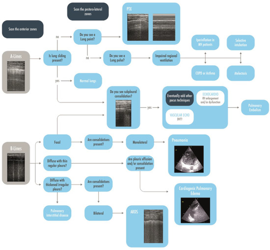 Lung ultrasound (LUS) was considered unhelpful in the past due to the intrinsic impossibility of the ultrasound to penetrate the air; the only recognized indication was the assessment of pleural effusion [1]. Over the last few years, its usefulness for the clinical management of different diseases has been widely demonstrated [1,2]. Point-of-care ultrasonography may reduce the use of chest x-rays, computed tomography (CT) scans, and other radiation imaging techniques in the Intensive Care Unit (ICU) and in the Emergency Department (ED) [3,4,5]. The integration of bedside ultrasonography in the daily clinical activity of intensivists could reduce the risk of radiation exposure, need of patient transport, and hospital costs [6] and may redirect patient’s management [7]. A qualitative LUS approach is based on interpreting artifacts (A- and B-lines) and real images to distinguish between normal and pathological context. If a qualitative approach gives important information on the morphological assessment of the lung for the diagnosis, a quantitative approach allows us to extend the utility of the examination to lung monitoring [8]. The first section of this review aims to review how to perform a standard LUS examination and the basic LUS signs needed to interpret the images. The second section focuses on the ultrasound approach to different clinical scenarios frequently encountered in the daily clinical practice of physicians working in ED and ICU.