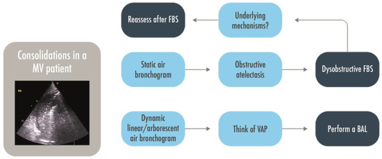 LUS is a valid alternative for an early diagnosis of pneumonia in adults in an emergency setting [51,58] where the visualization of a consolidated lobe is highly specific for the diagnosis. In intensive care patients under mechanical ventilation, where more intricated mechanisms may lead to a complete loss of aeration, mainly in the posterior fields, the presence of a tissue-like pattern is highly non-specific for ventilator-associated pneumonia; in this context, the interpretation of the air bronchogram is an additional value. A dynamic linear/arborescent air bronchogram within a consolidation has been demonstrated to be highly specific for a VAP [59,60]. A dynamic air bronchogram rules out obstructive atelectasis, which are instead characterized by a static bronchogram (in the initial phase) or by the absence of any air bronchograms (no air is present neither in the small airways) [61]. From these concepts, a clinical decision could be made: a consolidation with a static air bronchogram or without it suggests a nonpatent airway and drives to the indication for a disobstructive fiber-bronchoscopy (Figure 6) [2,59]. In a clinical trial including 80 mechanically ventilated patients in an ICU, the diagnostic accuracy of LUS, CXR, and clinical pulmonary infection score (CPIS) compared to the CT scan as a gold standard was evaluated. LUS had high sensitivity and specificity (91.67% and 100%, respectively), as well as high positive and negative predictive value (100% and 96%, respectively); it performed significantly better than CXR (p < 0.001) and a CPIS > 6 (p < 0.001) [62]. A color Doppler is appliable on a consolidated lung to evaluate the vascularization. The detection of a lung region with a complete loss of aeration and good perfusion is an indicator of intrapulmonary shunt in consolidated lobes, contributing to hypoxemia. This evaluation remains although only qualitative [15]. LUS color Doppler with an evaluation of intrapulmonary flow and dynamic air bronchograms has been recently seen to be the most frequent signs in veno–arterial extracorporeal membrane oxygenation patients with hospital-acquired pneumonia, with a lung ultrasound simplified clinical pulmonary score leading to better results than the classical CPIS, bioclinical parameters, or CXR [63]. LUS has also been confirmed to be a valuable tool for the bedside identification of pulmonary overinfections in COVID-19 patients already admitted to ICUs for pneumonia and ARDS. In a retrospective observational study, dynamic linear/arborescent air bronchograms within lobar/hemilobar consolidations were demonstrated to have a very high specificity [60]. In patients monitored by a daily assessment of a lung ultrasound score, an increase in the LUS score should raise the doubt of an overinfection [4,64]. The quantitative evaluation of a lung ultrasound for the assessment of lung aeration, however, has not been considered as a basic skill by the expert recommendations of the European Society of Intensive Care Medicine (ESICM) [27].