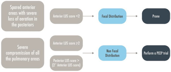 A personalized approach based on lung morphology and the identification of focal and diffuse patterns seemed not superior in the Live study to PEEP-FiO2 table in terms of survival of ARDS patients [65]. However, in this study the morphologic assessment was mainly performed with CXR, with a high percentage of misclassified patients that showed a severely increased mortality. If limiting the analysis to those correctly classified, the personalized approach determined a significant improvement in the survival rate. This underlines the importance of having a reliable method for the classification of lung morphology, both to allow personalization of ventilation strategy and to avoid misclassification, which negatively affects patients’ survival [66]. The LUS score has been proposed to classify lung morphology in focal and diffuse for invasively ventilated ARDS patients; when compared to the gold standard (i.e., CT scan), the anterior LUS regions showed to be the most discriminant between focal and non-focal morphology with an accuracy moderately increased with the integration of lateral and posterior findings [67]. Patients with a focal distribution, severe loss of aeration in the posterior areas, and spared anterior ones are usually prone-responders [68]. On the contrary, patients with diffuse distribution and compromission of all the fields, including the anterior ones are usually PEEP-responders (Figure 7) [69,70]. The LUS’ capability to predict the intensity of oxygenation response resulting from the prone position in severe or moderate ARDS was not confirmed by a prospective multi-center study; however, the overall responsiveness to pronation is normally not quantified by PaO2/FiO2 variations only. Moreover, the patients showing more significant improvement in LUS score after prone positioning were those with focal morphology [71]. The application of LUS to decide the ventilatory strategy and which is the best way to distinguish focal and non-focal patterns are still matters of research.