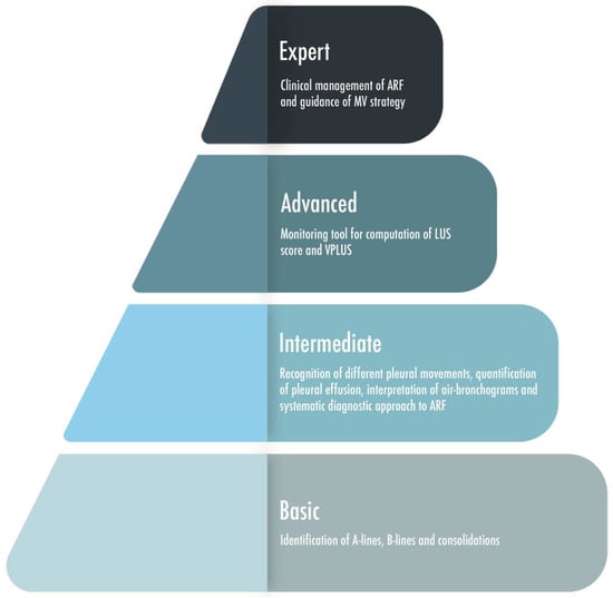 After the recently published consensus statement on the critical care ultrasound of the ESICM [27], an issue has been raised about the definitions of basic and advanced skills [103]. Pleural effusion is easy to identify, but recognizing the etiology and determining the volume can be more challenging. Similarly, B-lines are easy to recognize, but their etiology and clinical interpretation could be difficult to assess. An echo-texture of a lung consolidation is easily identified, but distinguishing between atelectasis and pneumonia would require the sonographer to be capable of recognizing dynamic air bronchograms and to interpret the color Doppler, which probably are at least intermediate skills [103]. Concern has been created, indeed, for the lack of clearly defined criteria in the scientific literature for defining basic lung ultrasonographic skills and distinguishing them from the advanced ones, especially in comparison with the cardiac ultrasound in the critical care setting, which has more literature in support and well-defined steps of knowledge [104]. So far, the only recognized advanced skill is the computation of the LUS score, which clearly requires a dedicated training [105]. A four-step definition of LUS skills, classified on the basis of the items that determine if a particular skill is assessed as basic or advance, has been proposed [103]. The incidence of the considered disease, the easiness to acquire the images and to interpret it, and finally the capability of answering to relevant clinical questions have been evaluated and, based on these, a suggested number of training scans has been proposed as the minimum to acquire specific LUS skills. If 10 trained LUS are enough to rule out a pneumothorax, 60 trained exams are needed to learn how to differentiate between atelectasis and pneumonia, and 80 exams are instead requested to acquire the competences to rule in a pneumothorax. An international study, willing to standardize the LUS training and conducted in 10 ICUs, among resident and staff working in intensive care units, anesthesiology services, emergency medicine, and internal medicine wards, concluded that 25 transthoracic ultrasound examinations supervised by an expert provide the basic skills for diagnosing normal lung aeration, interstitial–alveolar syndrome, and consolidation in emergency and critically ill patients [106]. Four-level steps of knowledge may be hypothesized: the basic level includes a simple identification of A-lines, B-lines, and consolidations [88]; an intermediate level may include pleural movement interpretation (sliding, lung pulse, lung point) and additional skills as pleural effusion quantification, air-bronchogram interpretation, and systematic diagnostic approach to acute respiratory failure; the advanced knowledges may include a quantitative lung ultrasound as a monitoring tool (computation of lung ultrasound score and of ventilator-associated pneumonia lung ultrasound score); and the expert level includes qualitative and quantitative LUS in the clinical management of acute respiratory failure patients and as a guidance to mechanical ventilation strategy (Figure 8). Research will have to confirm this hypothesis. How to reach an adequate training, so far missing [81,107], is also a matter of concern.