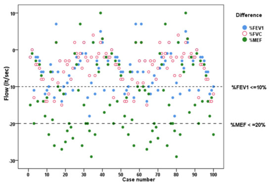 - Graham, B.L.; Steenbruggen, I.; Miller, M.R.; Barjaktarevic, I.Z.; Cooper, B.G.; Hall, G.L.; Halstrand, T.S.; Kaminsky, D.A.; McCarthy, K.; McCormack, M.C.; et al. Standardization of Spirometry 2019 Update. An Official American Thoracic Society and European Respiratory Society Technical Statement. Am. J. Respir. Crit. Care Med. 2019, 200, e70–e88. [Google Scholar] [CrossRef]