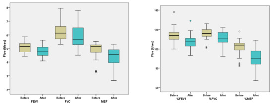 Lung function was assessed according to the ATS/ERS guidelines [39] on a spirometer (Ergocard Clinical with ExpAir Software, Medisoft Group, Namur, Belgium), and the following parameters were recorded: Forced Vital Capacity (FVC), FEV1, and MEF25–75. Spirometry was performed in a quiet and comfortable environment. Measurements were conducted by the same operator, in the morning. The subject was seated, with shoulders slightly back and, the chin slightly elevated, and a nose clip was used. There were four distinct phases of the FVC maneuver: (1) maximal inspiration, (2) a blast of expiration, (3) continued complete expiration [the expiration stops when a plateau has been reached or the forced expiratory time (FET) reaches 15 s, and (4) inspiration for a maximal flow back to maximum lung volume. The subject inserted a mouthpiece and was instructed to breathe normally or easily. For each pulmonary function test, the best three of all performed measurements, that met the ATS/ERS criteria were evaluated. The largest one was retained to calculate the spirometric values. A decrease in FEV1 ≥ 10% and/or MEF25–75 ≥ 20% in spirometry was considered a minimal clinically significant difference [8,41].