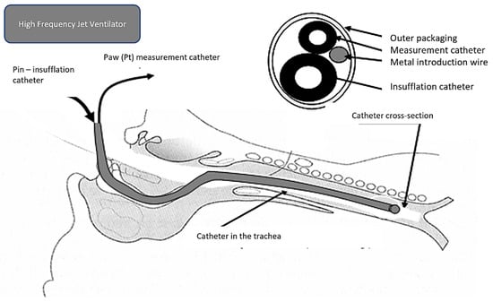 The present form of C-HFJV using the original double-lumen ventilation catheter (DVK) is presented in Figure 2. The principles of C-HFJV are shown in Figure 3. In this form of ALV, a ventilation catheter, which consists of an insufflation catheter, a measuring catheter, and a soft metal guidewire used to strengthen the shape of the catheter, covered in the plastic material package, is inserted into the trachea. The catheter, in its original construction, has an outer diameter of approximately 5.5 mm and a length of 27–28 cm.