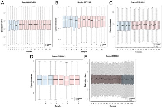 Five gene expression microarray datasets (GSE24206, GSE21369, GSE110147, GSE72073, and GSE32539) were selected in which the transcriptome of lung tissue from IPF patients was compared to that of healthy controls. The datasets were obtained from the National Center for Biotechnology Information-Gene Expression Omnibus (NCBI-GEO). An overview of the datasets included in this meta-analysis is shown in Table 1. A total of 76 control samples and 174 IPF samples were integrated using the MetaDE R package. In addition, the homogeneity of the expression values of all the datasets was assessed, and the box plot indicates the measure of centrality of each of the datasets and shows the homogeneity in the expression values (Figure 1A–E).