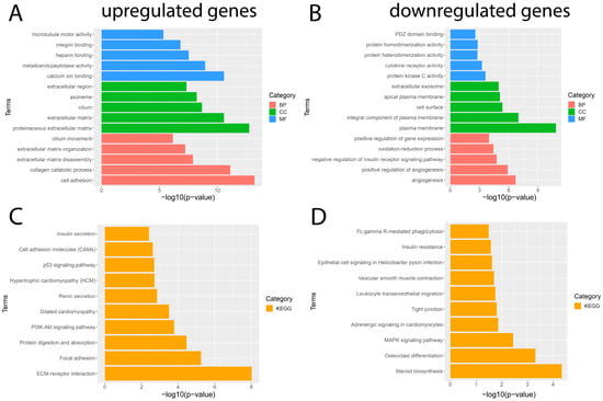 To gain a better understanding of the main functions and mechanisms in which DEGs are involved, we performed GO enrichment and KEGG pathway analyses employing the DAVID platform with a significance value of p < 0.05. The results obtained from the GO analysis showed that the BP of the significantly upregulated genes were mainly enriched for cell adhesion and the collagen catabolic process; the significantly downregulated genes were mainly involved in angiogenesis and the positive regulation of angiogenesis. The MF of significantly upregulated genes was mainly enriched for calcium ion binding and metalloendopeptidase activity; significantly downregulated genes were involved in protein kinase C activity and cytokine receptor activity. The CC of significantly upregulated genes was mainly enriched for the proteinaceous extracellular matrix and extracellular matrix; significantly downregulated genes were mainly involved in the plasma membrane and plasma membrane integral component (Figure 3). In addition, the results obtained from the KEGG pathway enrichment analysis showed that the significantly upregulated genes were mainly enriched in pathways such as ECM–receptor interaction, focal adhesion, protein digestion, and uptake; the results obtained for the significantly downregulated genes showed that they were mainly enriched for the steroid biosynthesis pathway, osteoclast differentiation, and MAPK signaling pathway (Figure 3). The complete list of GO and KEGG pathway analyses can be found in Tables S2 and S3.