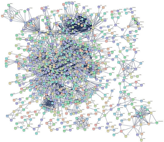 We evaluated protein interactions among DEGs to obtain a view of their involvement in the development of IPF using STRING and Cytoscape software. The results indicated that the DEGs form a complex interaction network containing 1863 nodes and 3310 edges with an average node degree of 3.55 and a clustering coefficient of 0.33. The expected number of edges was 2430, which means that it was much smaller than the actual edges found, and the p-value of PPI enrichment was <1.0 × 10−16 (Figure 4, Table S4). Nodes not connected to the network were excluded. The network had considerably more interactions than expected, indicating that the DEGs are biologically connected as a group.