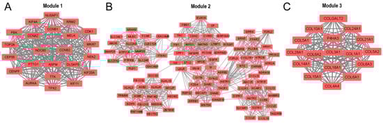 In addition, the entire PPI network was analyzed using the Molecular Complex Detection (MCODE) add-on of Cytoscape software, and 51 significant modules were identified. The three modules with the highest average MCODE score, module 1 (21,545), module 2 (17,660), and module 3 (16,875), contained 23, 101, and 17 genes, respectively, in addition to 237, 883, and 135 edges, respectively (Figure 5A–C). Each of these modules can be interpreted as significantly functional modules.