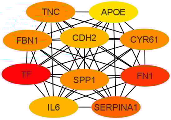 Next, the cytoHubba add-on of Cytoscape software was used to identify the top 10 hub genes from DEGs by the maximal clique centrality (MCC) method, which were tenascin-c (TNC), cadherin 2 (CDH2), apolipoprotein E (APOE), secreted phosphoprotein 1 (SPP1), serpin family A member 1 (SERPINA1), fibrillin 1 (FBN1), interleukin 6 (IL6), fibronectin (FN1), cysteine-rich angiogenic inducer 61 (CYR61), and serotransferrin (TF) (Figure 6). Of these, seven represented upregulated genes (CDH2, FBN1, FN1, APOE, SPP1, TF, and TNC), and three represented downregulated genes (CYR61, SERPINA1, and IL6).