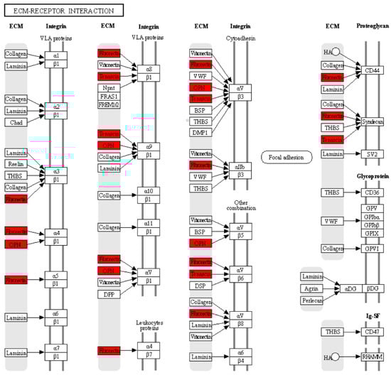 According to the KEGG analysis, the hub genes are related to the receptor–ECM interaction pathway. The red color indicates that three genes: SPP1 (OPN), TNC, and FN1 were significantly enriched in the receptor–ECM interaction pathway. The black arrows indicate the interaction of ECM proteins (OPN, TNC, and FN1) with cell surface proteins (integrins and proteoglycans).