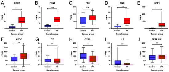 Validation of the expression of 10 hub genes in the GSE92592 dataset. Differences in the expression of the hub genes (A) CDH2, (B) FBN1, (C) FN1, (D) TNC, (E) SPP1, (F) APOE, (G) TF, (H) CYR61, (I) IL6, and (J) SERPINA1 between the idiopathic pulmonary fibrosis (IPF) group and the control group are shown. FPKM = fragments per kilobase of transcript per million mapped reads. * = p < 0.05, ** = p < 0.01, and *** = p < 0.001. ns = not significant.