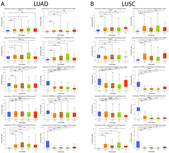 Expression levels of the 10 hub genes concerning individual cancer stages in lung cancer and normal tissue samples in the UALCAN database. (A) The expression level of the 10 hub genes in LUAD patients and their respective controls concerning individual cancer stages (stage 1, stage 2, stage 3, and stage 4). (B) The expression level of the 10 hub genes in LUAD patients and their respective controls concerning individual cancer stages (stage 1, stage 2, stage 3, and stage 4). ns = not significant, * = p < 0.05, ** = p < 0.01, and *** = p < 0.001.