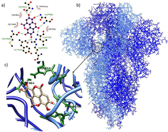 Molecular coupling of the ellagic acid ligand (red) with the spike protein results in a binding free energy of −9.3 kcal/mol (a) 2D scheme showing hydrogen bonds (green) and hydrophobic interactions (black); (b) site of interaction of the protein-ligand complex; and (c) 3D conformation of the binding site of ellagic acid with the spike (S) protein.