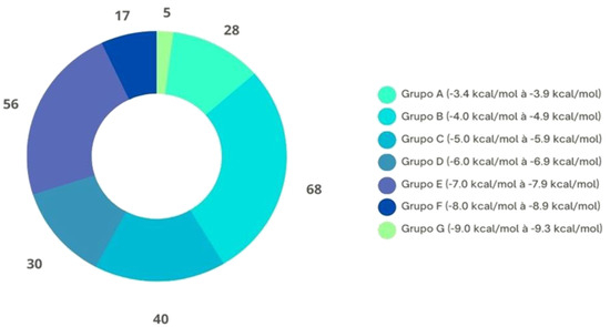 Figure 2 shows all docking performed in this study, with binding energies ranging from −3.4 to −9.3 kcal/mol. The group that obtained the most interactions was group B, which presented energies from −4.0 to −4.9 kcal/mol. Two groups, F and G, had the lowest number of molecular interactions, 22 in total, with energies ranging from −8.0 to −8.9 kcal/mol and from −9.0 to −9.3 kcal/mol, respectively. However, these were the results of the molecular interaction of the ligands with the targets, which was considered more satisfactory in this study (Table 3).