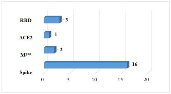 The best molecular interactions with the receptors shown in Figure 3 come from 14 ligands (Figure 4). Some of these ligands had good interactions with more than one protein. It was the spike protein that stood out as the receptor with the most effective complex interactions. It made connections with 16 different compounds. This protein is important for a virus to get into a cell because it interacts with ACE2. Two ligands worked well for the anchoring process with Mpro, which is in charge of virus replication. However, only one compound interacted with ACE2, which is the cell receptor that lets the SARS-CoV-2 virus into the body. Finally, three coupling results with RBD were obtained.