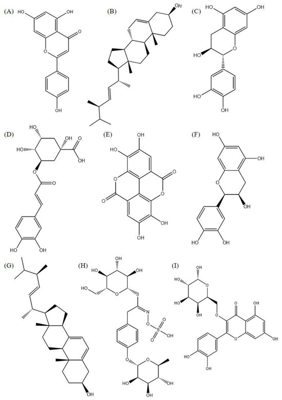 A total of 61 chemical compounds from the M. oleifera species were selected, covering classes such as flavonoids, alkaloids, terpenoids, coumarins, and saponins, among others, in national and international scientific databases such as Scientific Electronic Library Online (Scielo), National Center for Biotechnology Information (PubMed), Elsevier Group (Scopus and Science Direct), and Google Scholar. The search was conducted using the keyword “Moringa oleifera” in combination with “chemical constituents” or “phytochemicals”. The corresponding chemical structures were acquired through the Pubchem platform (http://pubchem.ncbi.nlm.nih.gov/, accessed on 3 September 2022).