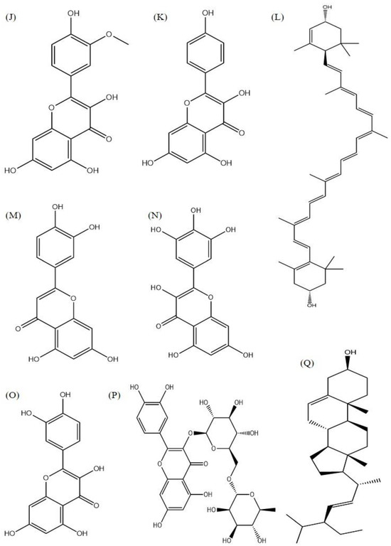 Two-dimensional chemical structure (2D) of the molecules that presented the best results in molecular interaction ((A) (Apigenin); (B) (Brassicasterol); (C) (Catechin); (D) (Chlorogenic acid); (E) (Ellagic acid); (F) (Epicatechin); (G) (Ergosterol); (H) (Glucomoringin); (I) (Isoquercetrin); (J) (Isorhamnetin); (K) (Kaempferol); (L) (Lutein); (M) (Luteolin); (N) (Miricetin); (O) (Quercetin); (P) (Rutin); and (Q) (Stigmasterol)).