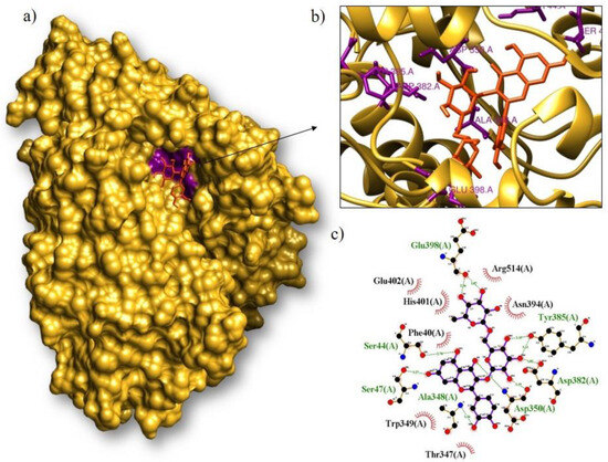 Rutin, isoquercitrin, and lutein were the molecules that interacted best with proteins ACE2, Mpro, and RBD during the molecular docking process. Figure 5 shows that the compound rutin formed the complex with the cellular protein ACE2 that had the lowest interaction energy. It had an interaction energy equal to binding of −8.2 kcal/mol. Seven amino acids (Glu398, Tyr385, Asp382, Asp350, Ala348, Ser47, and Ser44) and seven amino acids (Arg514, Asn394, Thr347, Trp349, Phe40, His401, and Glu402) had hydrogen bonds with it.