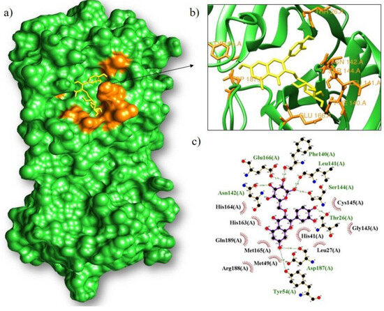 Molecular coupling of the isoquercitrin ligand (yellow) with the Mpro results in a binding free energy of −8.9 kcal/mol ((a) site of interaction of the protein-ligand complex; (b) 3D conformation of the binding site of isoquercetrin with the Mpro protein; and (c) 2D scheme showing hydrogen bonds (green) and hydrophobic interactions (black)).
