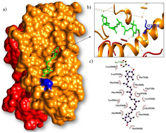 Molecular coupling of the lutein ligand (green) with the RBD results in a binding free energy of −8.7 kcal/mol ((a) site of interaction of the protein-ligand complex; (b) 3D conformation of the lutein binding site with the spike/ACE2 complex and (c) 2D scheme showing hydrogen bonds (green) and hydrophobic interactions (black)).