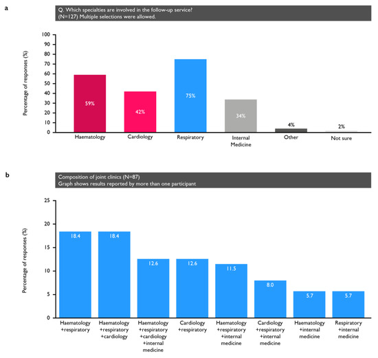 (a) Specialties involved in those centres that had dedicated clinics; (b) the composition of the clinics that involved multiple specialties.