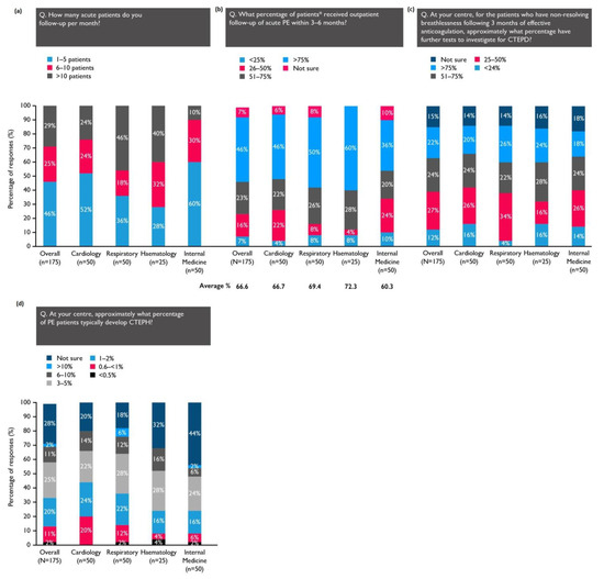 * Of those managed as outpatients at the physician’s centre. (a) The number of PE patients who are seen by the respondents; (b) the percentage of those that receive a follow-up within the recommended timeframe; (c) the percentage of patients with persistent dyspnoea after 3 months of therapeutic anticoagulation who are investigated for CTEPD; (d) the percentage of patients who typically develop CTEPH, according to the respondents.