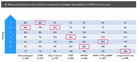 Tests ranked in the order they would be used to investigate for CTEPD by physicians who routinely investigate for CTEPD following PE (N = 97). Red boxes indicate the most common ranking allocated to each investigation. 6MWD = 6 min walking distance; BNP = brain natriuretic peptide; CPET = cardiopulmonary exercise test; CTPA = computed tomography pulmonary angiogram; NT-proBNP = N-terminal pro-brain natriuretic peptide; Q = perfusion; V/Q = ventilation/perfusion.