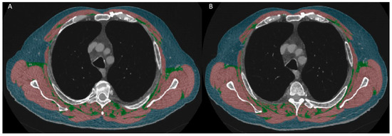 Body composition was assessed based on a single axial slice at the first slice above the aortic arch on the HRCT [7,8]. Threshold-based semiautomated “Viking Slice” software (version 22.02.2021) was used for segmentation [30]. Attenuation between −29 and +150 HU was considered muscle tissue, while between −190 and −30 HU was considered fat tissue [30,31]. Muscle and fat areas were reported as cm2 and indices were reported as height-adjusted areas in cm2/m2, along with density in mean Hounsfield units (HUs). Figure 1 shows an example of segmentation.