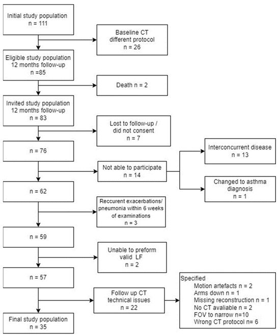 Flowchart of exclusion and inclusion of patients. CT: Computed tomography; FOV: field of view; LF: lung function assessment.