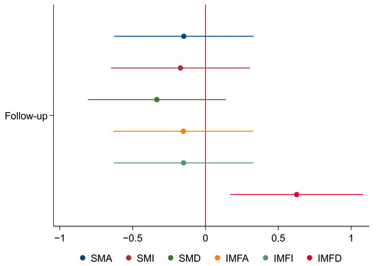 Forest plot of changes in thoracic muscle measurements at follow-up using standardized estimates and a 95% CI. The standardized estimates and CI were calculated by dividing the crude estimates by their respective standard deviation to facilitate meaningful comparison due to variations in effect size. CI: Confidence interval; SMA: skeletal muscle area; SMI: skeletal muscle index; SMD: skeletal muscle density; IMFA: inter-and intra-muscular fat area; IMFI: inter- and intra-muscular fat index; IMFD: inter-and intra-muscular fat density.