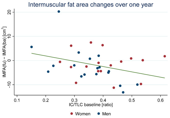 Our study revealed a significant negative association between IC/TLC, ΔIMFA, and ΔIMFI over one year based on multivariate linear regression. This indicates that, with decreasing IC/TLC, there tends to be an increase in inter- and intra-muscular fat. This aligns with IC/TLC being a critical parameter for hyperinflation in patients with COPD, which again is linked to several metabolic changes, including increased energy expenditure and decreased exercise capacity, ultimately resulting in changes in body composition [36,37,38,41,42,43,44]. This suggests that the IC/TLC ratio may not only be an indicator of lung hyperinflation in COPD but also a potential marker for metabolic changes.
