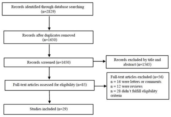 A systematic search to retrieve studies that assessed the diagnostic accuracy of LUS for pneumonia in adults was performed in the Medline, Cochrane and Crossref databases. A total of 2829 studies were identified. After the first screening stage (title, abstract and keywords), 85 relevant studies were retrieved, and their full texts were reviewed for eligibility. A total of 29 studies with 6702 participants satisfying the inclusion criteria were analyzed (Figure 1). The study characteristics are shown in Table 1.