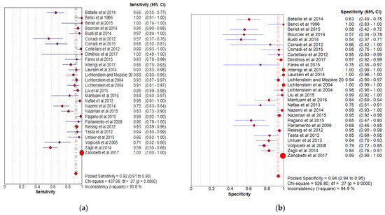 (a) Forest plot for sensitivity; (b) forest plot for specificity (LUS has an overall sensitivity of 92% (95% CI, 91–93%) and specificity of 94% (95% CI, 94–95%) in the diagnosis of pneumonia in adult).