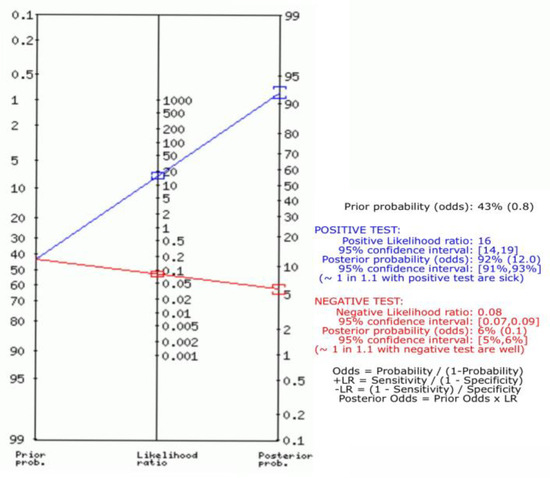Fagan plot analysis showed the prior probability is 43, the positive likelihood ratio is 16, the probability of post-test is 92, the negative likelihood ratio is 0.08, and the probability of the post-test is 6.