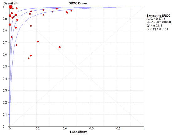 Summary receiver operating characteristic curve for LUS in all studies. The area under the ROC was 0.9712. The overall diagnostic odds ratio as per random effect model was 139.65 (57.02–342.02). The red dot in the SROC plot is each individual paper with the size of the ball corresponding to the same sample of the paper and in turn the weight of the paper in the analysis. The blue lines demonstrate the SROC curve approximations.