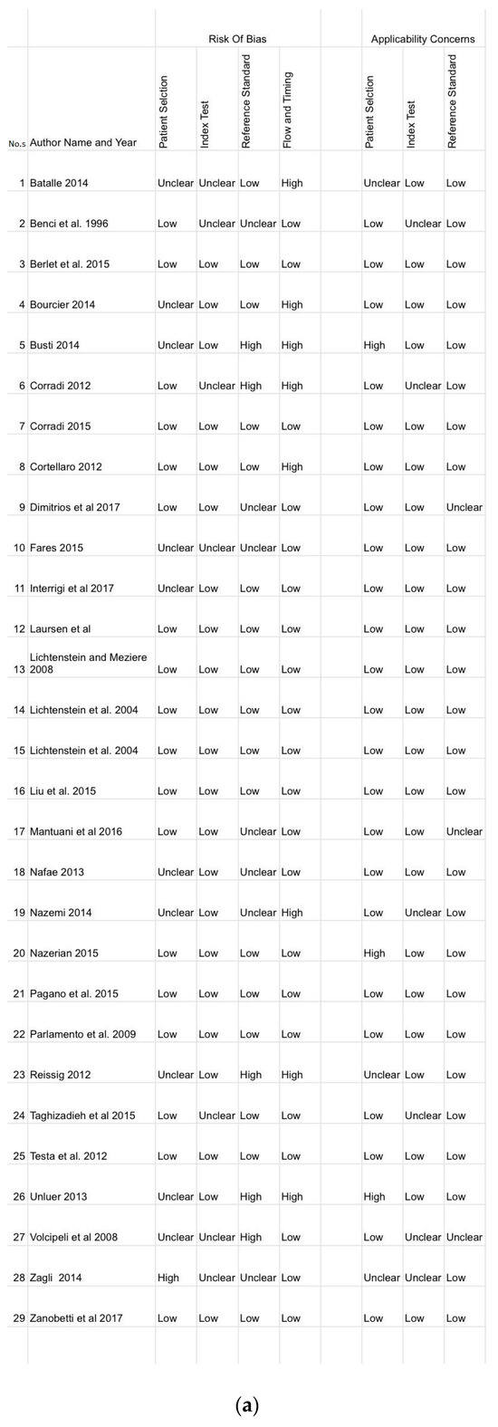 Two authors independently performed the search of the literature and screened the title and abstract of each article. Full-text articles that met the inclusion criteria were retrieved for this review. Any discrepancies during the entire process were resolved by consensus. The following data were extracted from each study: first author’s name, year of publication, country of origin, study design and setting, sample size, mean age and sex of the population, inclusion criteria expertise of operator, ultrasound diagnostic criteria considered in each study, and reference diagnostic standard.